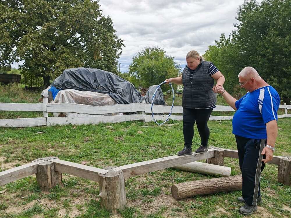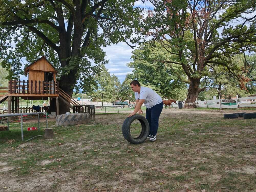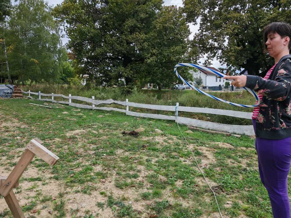Dan smo započeli lagano, hranjenjem životinja i uživanjem u prirodi, a zatim se prepustili igri s velikim starim gumama. Koturali smo ih niz ranč, pokušavali ih sustići, a potom ih vraćali – koturajući ili noseći. Smijeha nije nedostajalo, a ni dobrog zagrijavanja!