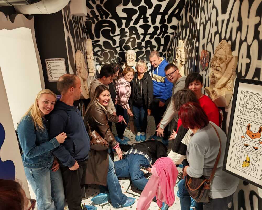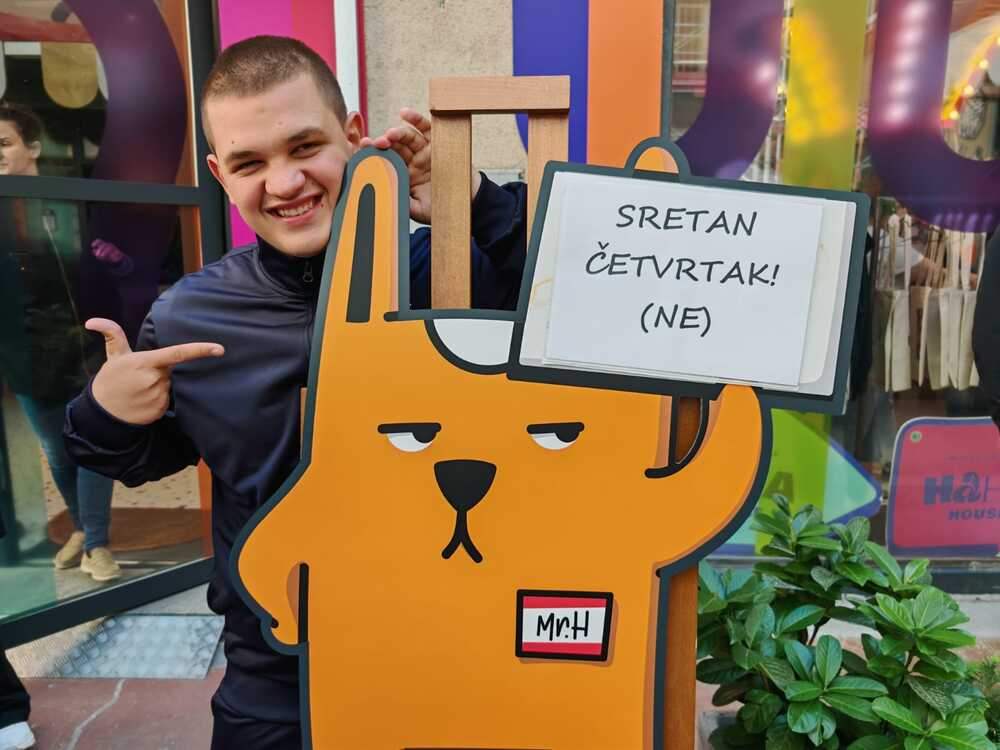 Ulaskom u HaHaHouse otkrili smo razigrane instalacije i interaktivne postave koji pozivaju na sudjelovanje i dobru zabavu. Među njima glavnu riječ vodi animirani lik Mr. H., sarkastičan i skeptičan vodič koji na humorističan način kritizira ozbiljnost modernog društva, dok ga likovi poput pametnog telefona, “vječnog objašnjivača šala” ili koke koja “malo” kasnije kopča sve fore dopunjuju u prikazu smiješne strane svakodnevice. Da je smijeh najbolji lijek, je potpuna istina, osim kad ti pukne smjehuljak od nekontroliranog smijanja haha.